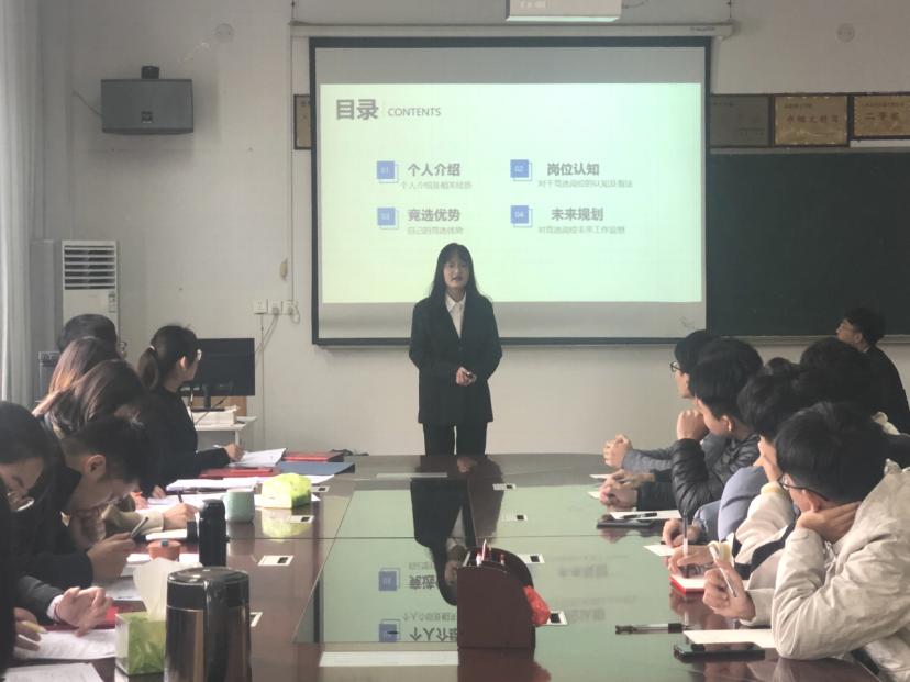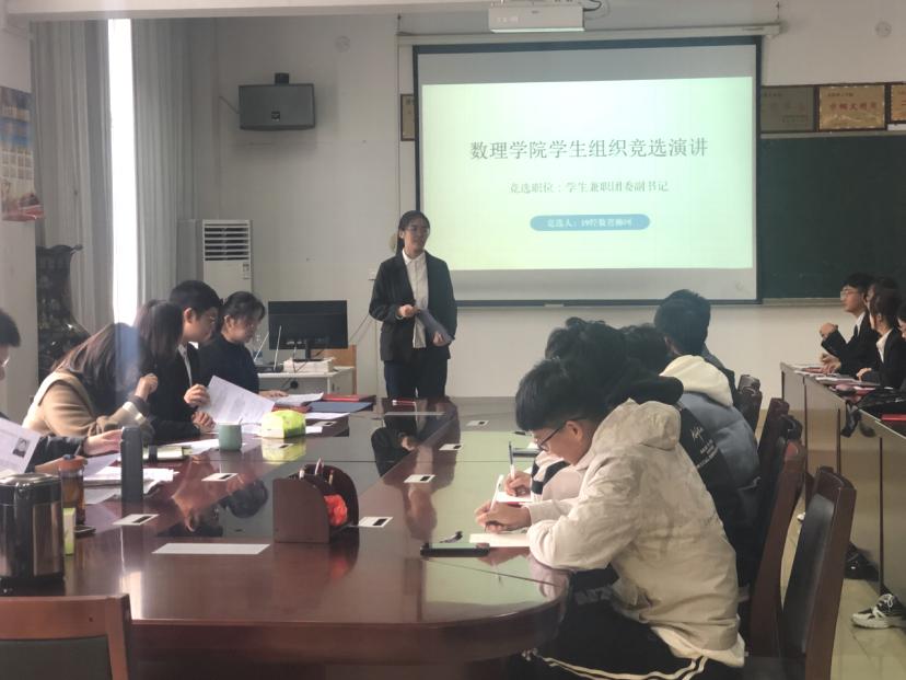七位竞聘者分别就自己认识、工作成绩、未来展望等方面进行竞聘演讲。面对评委的提问,竞选者们纷纷阐述真实想法,展示对于学生工作的理解与想法。秉承民主公正公平的原则,由老师、第一届学生组织主席团、部长和班委代表组成的评审团对竞选人员进行了现场投票。