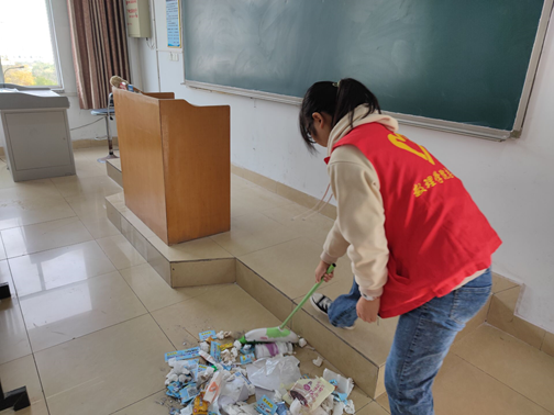 教学楼是同学们学习知识和成长的地方,其清洁度直接影响着老师教学效果以及学生们的身体健康。学生志愿者们有序地来到教学楼内开始工作,,仔细地清扫、擦除教室里的垃圾和灰尘。学生志愿者们不辞辛劳,给同学们带来清爽舒适的工作和学习环境,充分展现了我院学子精神饱满的状态和乐于奉献的精神。