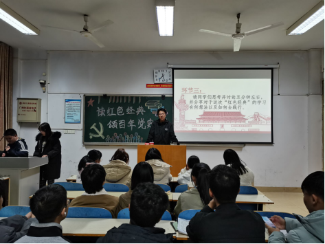 本网讯(学生记者/陈红)11月7日,我院在13教514教室开展“读红色经典,颂百年党史”主题班会,本次班会由21级团支书陈瑞雯和刘艺楠主持,21级全体同学参加。