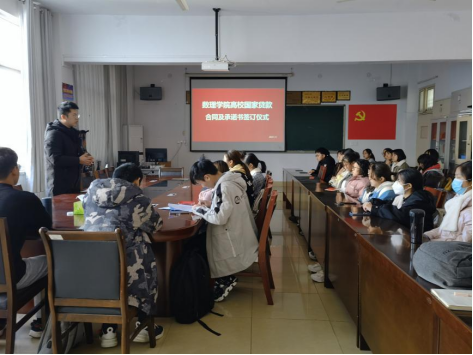 会上,谭萌就国家助学贷款相关政策向同学们做了详细介绍并耐心地给参贷学生讲解贷款合同的填写内容和注意事项,指导学生签订贷款合同和承诺书。签订仪式结束后,谭萌向同学们讲解了国家助学贷款和助学资助相关政策,重点说明了国家助学还贷流程、还款期限、贷款利率和提额操作等方面的具体注意事项。他强调,希望同学们珍惜助学贷款的机会,努力学习,回报社会,做一名自立自强的当代大学生。