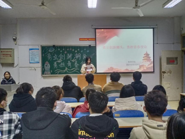 本网讯(学生记者/陈红)11月21日,我院在13教514教室开展“勇立创新潮头,勇担青春使命”主题团日班会,本次班会由班级团支书主持,21级全体同学参加。