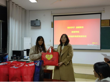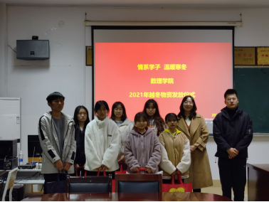 本网讯(学生记者/刘思航)11月25日,数理学院在13号教学楼二楼会议室举行“情系学子 温暖寒冬”2021年越冬物资发放仪式,数理学院分团委副书记冯清、资助专干老师谭萌出席仪式。