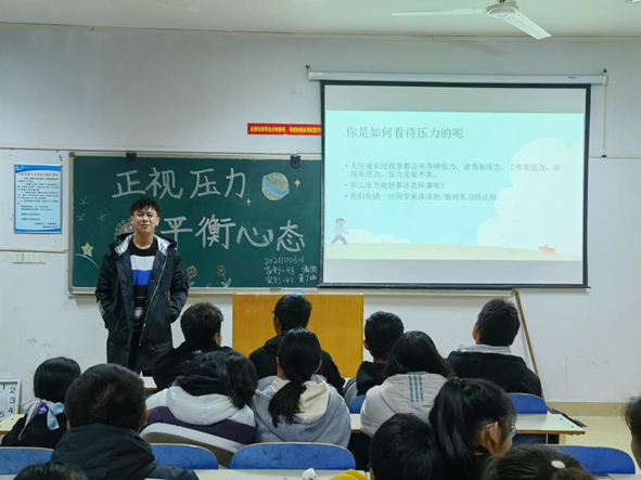 本网讯(学生记者/赵婧辛)为引导大学生正确看待学业、生活压力,保持良好的心态。12月5日,我院于13教510和514举办“正视压力,平衡心态”心理班会。21级全体学生参加。