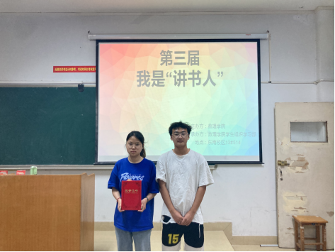 活动伊始,21经数班董海风为大家分享了《我的二本学生》,小说作者从自身的教学日常写起,通过多种教学形式,获得了学生成长的第一手资料,并通过这本书折射出当下多数普通年轻人的状况,她分享到,每一次出发,都是向上的攀登;每一段经历,都可以成为新的起点。20经数班赵甲骥通过书籍《天道》来讲述他要分享的书籍《遥远的救世主》,他通过对书中主要人物的解读告诉大家,在生活中要做一个目标明确、独立自主、做事果断的人,面对繁杂的事物要有精准的判断力。参赛者们纷纷通过精彩激昂的演讲赢得场下一片掌声。