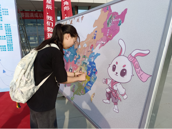 新生到达17教迎新现场后,开启专“数”于“理”之旅。转动幸运转盘,开启你的专“数”幸运,获得专属礼物;贴上专属贴纸,点亮你的专“数”城市;定格大展“鸿兔”,拍出你的专“数”照片;挑选暖心寄语,领取你的专“数”祝福。