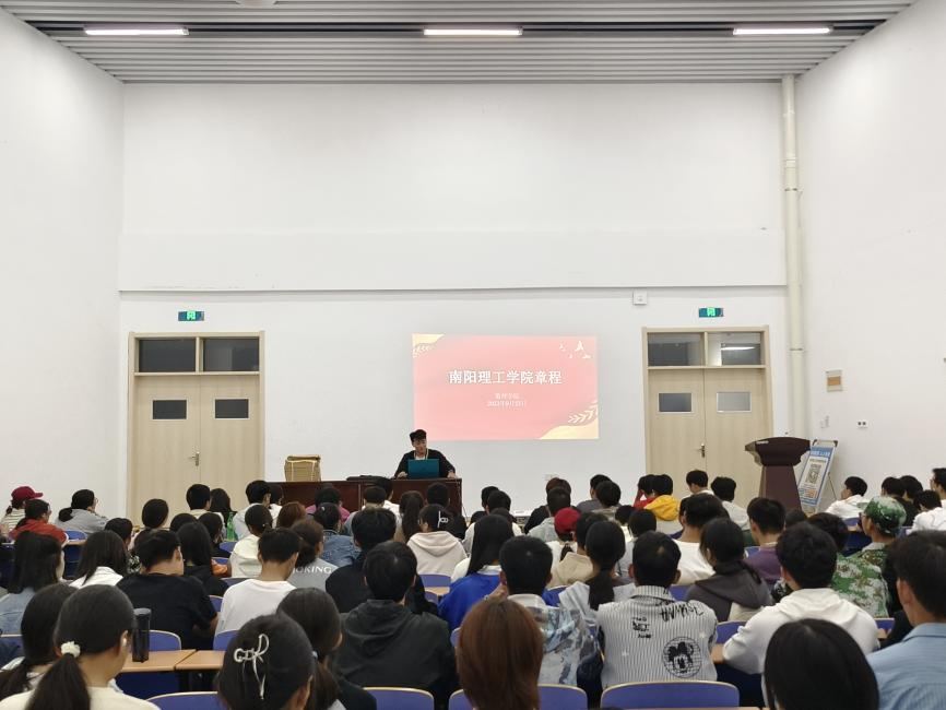 本网讯(学生记者/马晶晶)为促进新生良好的行为习惯和负责任的行为态度,9月25日,数理学院在17教开展《南阳理工学院章程》讲解,由23级班导巩世杰主持,23级全体新生参加。