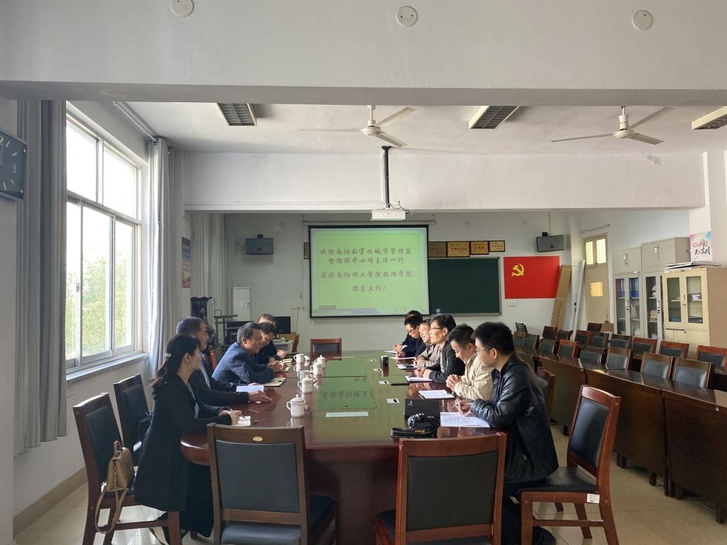 10月21日上午,南阳理工学院数理学院与南阳市数字化城市管理监督指挥中心双方在数理学院会议室洽谈全面合作暨成立“南阳数字化产业学院”和“南阳理工学院数理学院实践教学基地”,“ 南阳数字化城市管理科研基地”相关事宜。南阳市数字化城市管理监督指挥中心领导班子在靖安猛主任的带领下与数理学院领导班子牛军科书记、郭学军教授、牛玉俊教授、王瑾锦副书记等共同出席了会议,会议由数理学院负责人郭学军教授主持。